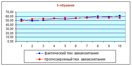 По полученным значениям проведенного исследования, наиболее достоверно описывающая данный процесс, является кривая обратнологарифмическая и экспоненциальная простая, но показатели у кривой экспоненциальной простой лучше. Графическое изображение изменения выполненного общего тоннокилометража авиакомпании за 10 лет для каждой из аппроксимирующих зависимостей можно увидеть на рис.1. Средний квадрат ошибки меньше и коэффициент детерминации выше, что говорит о более точном описании процессов. Прогноз делаем на основе экспоненциальной простой: объем выполненного общего тоннокилометража авиакомпании на следующий год может быть достигнут 391,84 млн. т-км.